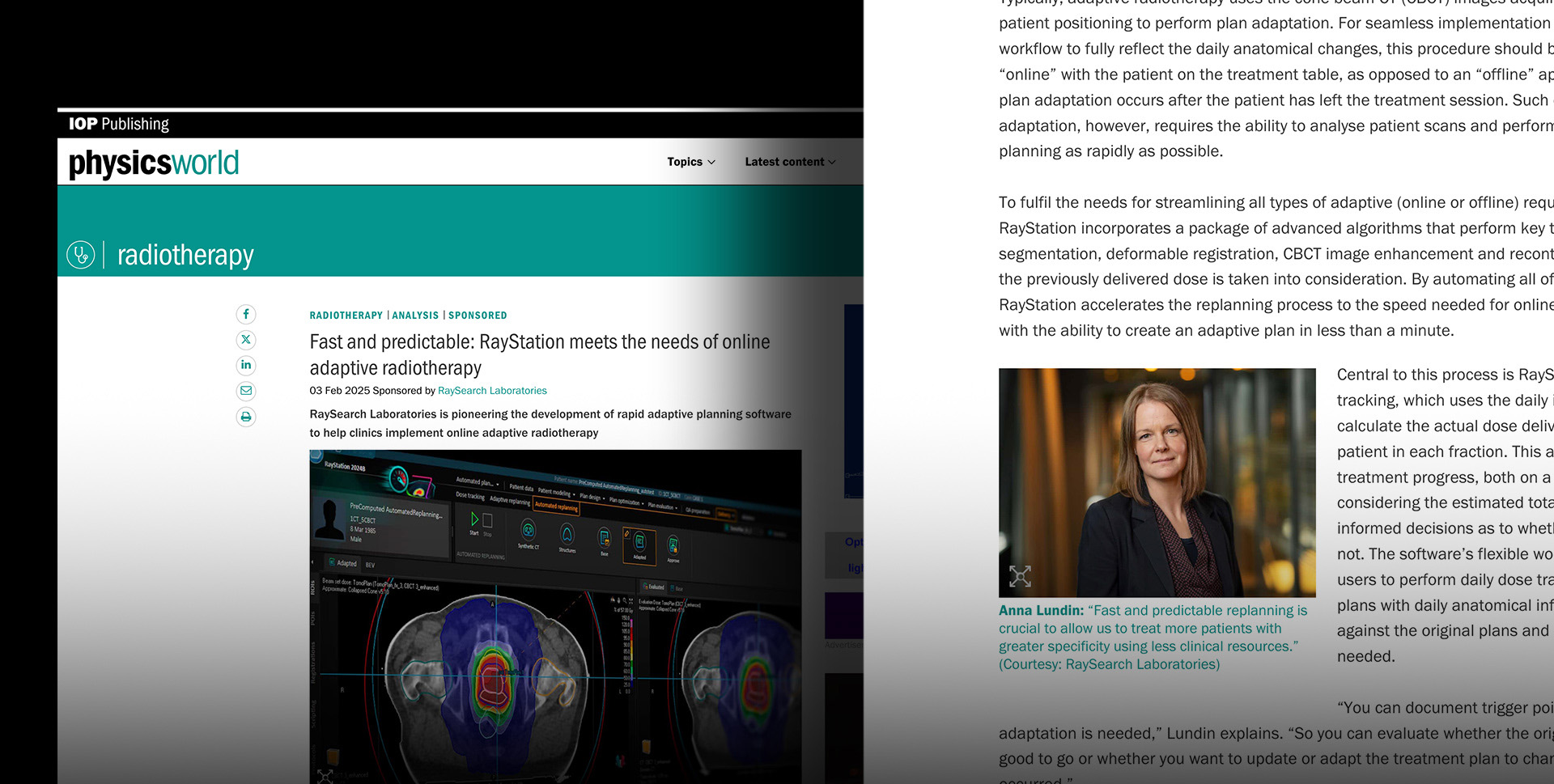 Adaptive radiotherapy has long been a future topic to discuss. While others were still debating its feasibility, we focused on making it a reality. At RaySearch, adaptive radiotherapy is not an add-on — it is built in.