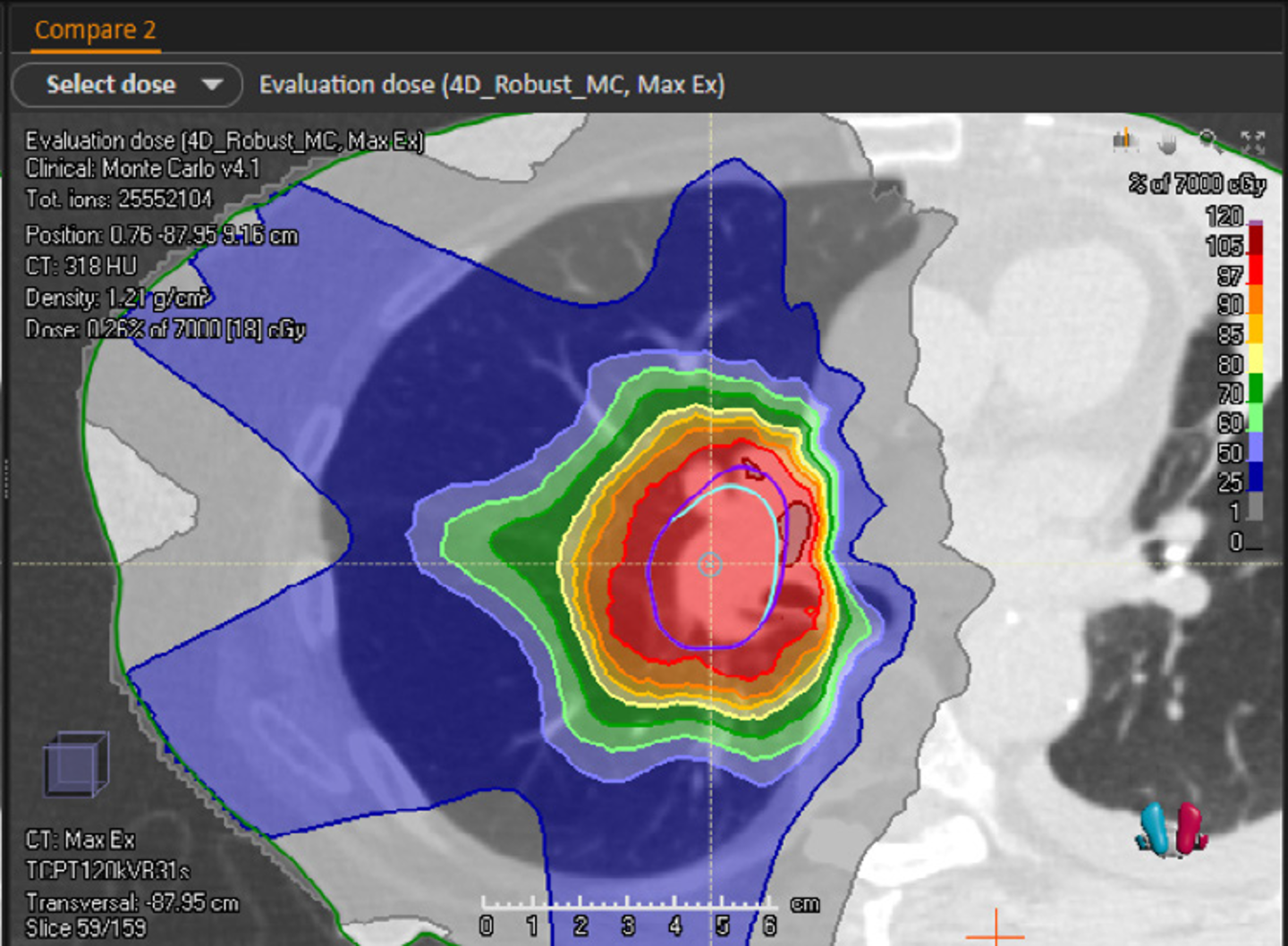 Treating lung cancer with radiation therapy can be challenging due to the proximity to critical structures and surrounding healthy lung tissue. The precision of proton therapy – and PBS in particular – enables much more conformal radiation, with higher doses delivered to tumors and lower doses to healthy tissues.