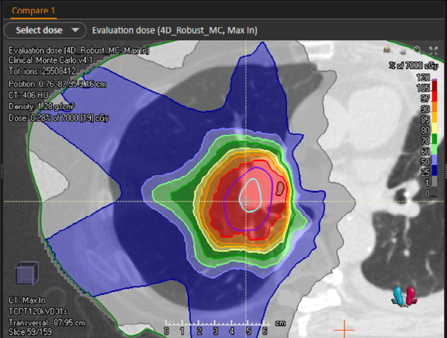 For the 4D-robust lung plans, the CT data from the maximum, minimum, mean, and one of the intermediate breathing phases are used. Both layer and volumetric repainting are incorporated to reduce the interplay effect with PBS1. A detailed validation of this method has been summarized in a paper submitted to Int. J. Particle Therapy2. For the treatments gated by breath-hold, regular 3D robust plans are created on the planning CT taking setup and range uncertainties into account.