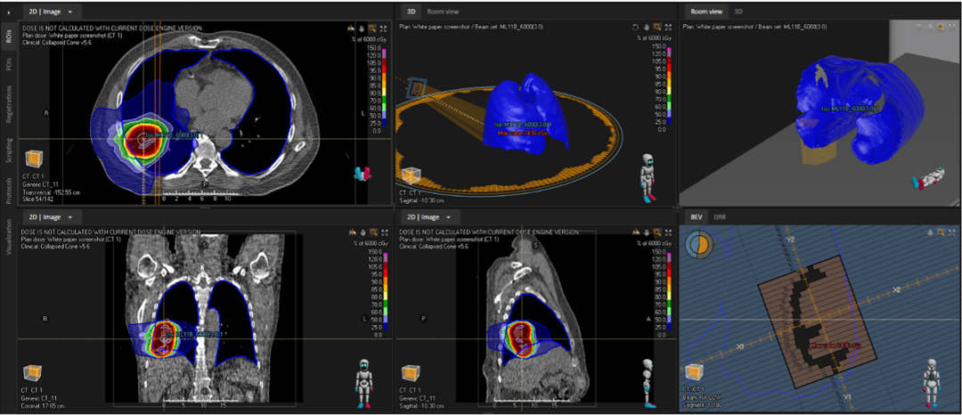 Deep learning doses serve as a basis for mimicking optimization, facilitating the rapid creation of executable plans. Plans can be further refined and adjusted as with any conventional plan in RayStation. Deep learning planning is fully scriptable, which allows for automated pre-planning via batch processing of patients during off-hours. An example of the output produced by the model is illustrated in Figure 2.