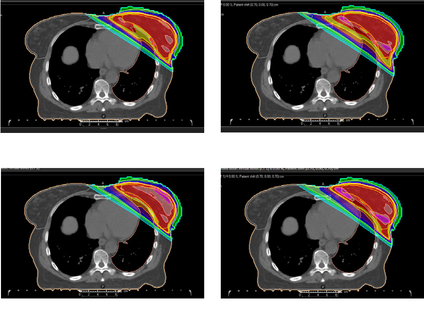 Robust optimization for IMPT applied to a 4D-CT lung case subject to at most 0.5 cm setup errors and 3.0 % density errors was compared to margin-based planning. The ten phases of the 4D-CT were included in the robust optimization. Transversal slices of the planning CT (CT 1) under the nominal scenario and of a non-planning CT (CT 6) under a perturbed scenario are shown in Figure 2. The figure illustrates that robust optimization can lead to improved robustness at the same time as decreased integral dose compared to conventional margins.