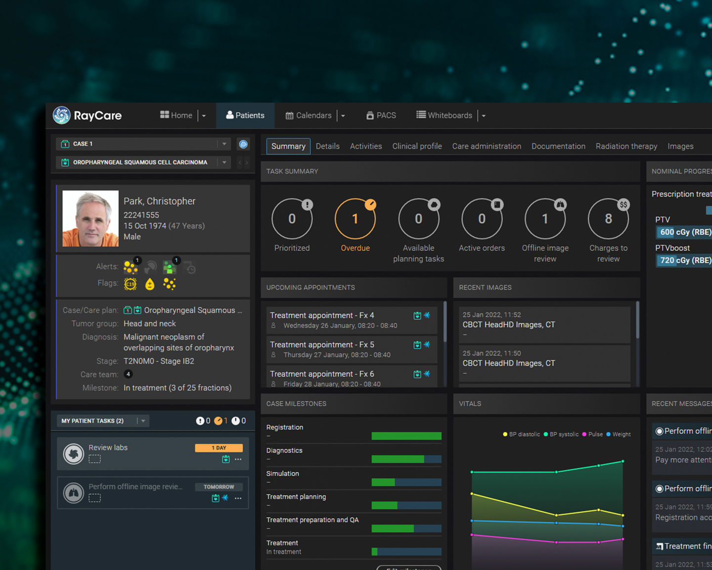The RayCare* patient chart contains a wide range of tools to manage clinical and administrative patient information. Different workspaces document the patient’s treatment progress from referral through treatment and follow-up. All information recorded in RayCare is accessible to perform clinic specific analysis and gain insight into the overall patient population and clinical processes.