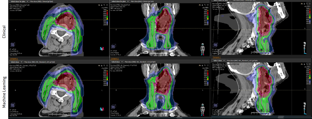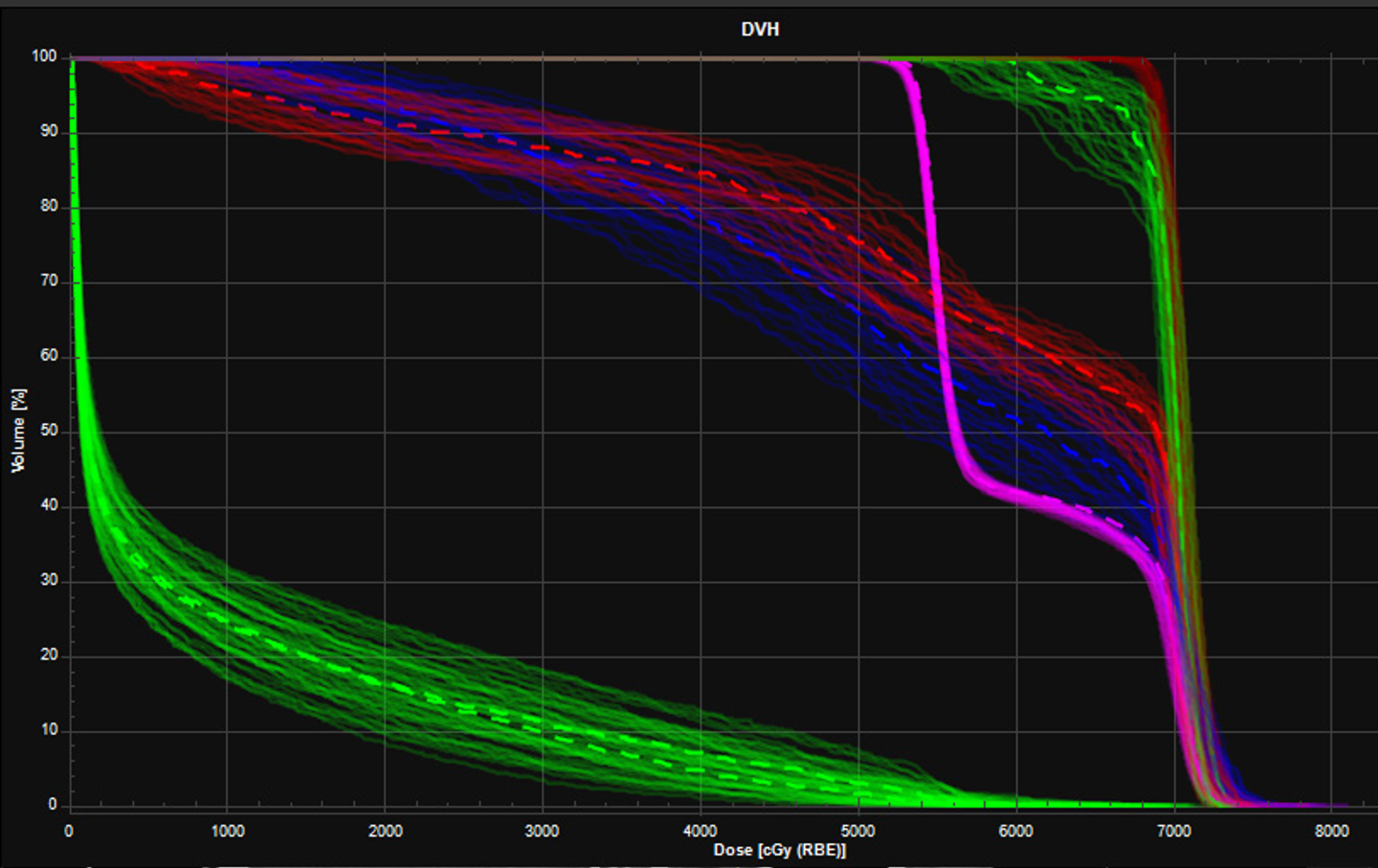 The study focused on robust IMPT plans for oropharyngeal patients and used the machine learning automated treatment planning method that was released in December 2018. This algorithm learns from historical patient and plan data and infers a 3D spatial dose on a new patient geometry. The historical data used to create the machine learning model consisted of 80 oropharyngeal head and neck cancer patients, that were treated with IMPT the last two years at the UMCG Proton Therapy Center.