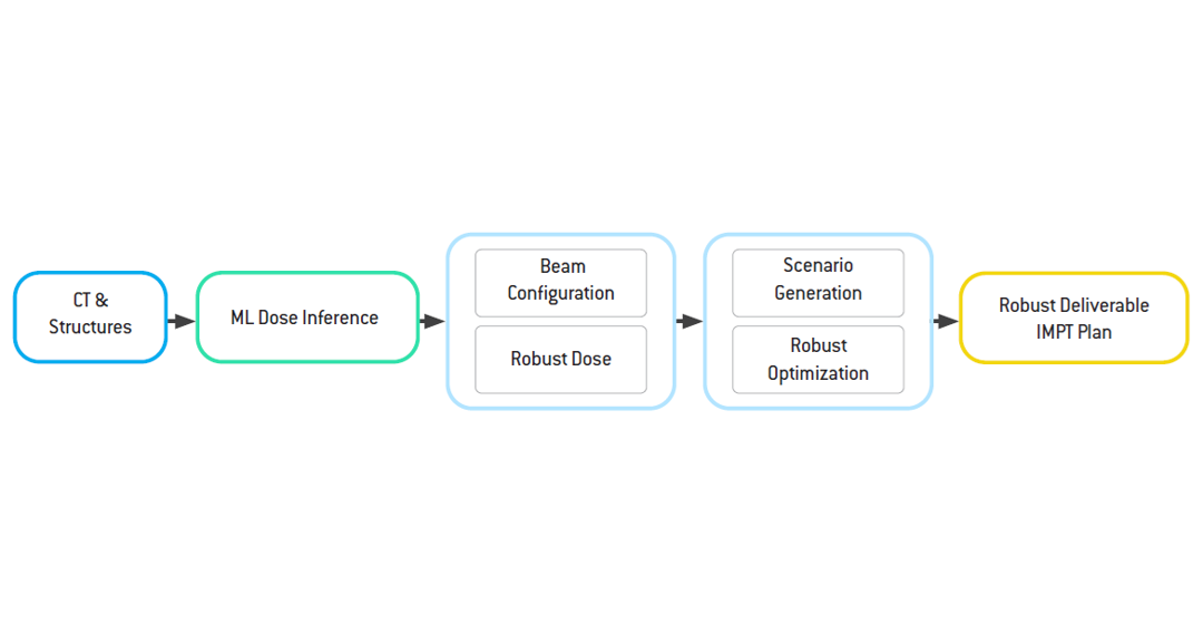 The machine learning planning framework in this study consists of a machine learning algorithm that infers a robust dose distribution for a novel patient, given CT as well as structures and then performs robust optimization with the goal of mimicking the machine learning dose. Multiple scenarios, the beam configuration, and other physical constraints are considered by the robust optimization. Effectively, this framework produces an IMPT plan for the configured delivery. This optimization can be applied for several treatment techniques, such as pencil beam scanning.