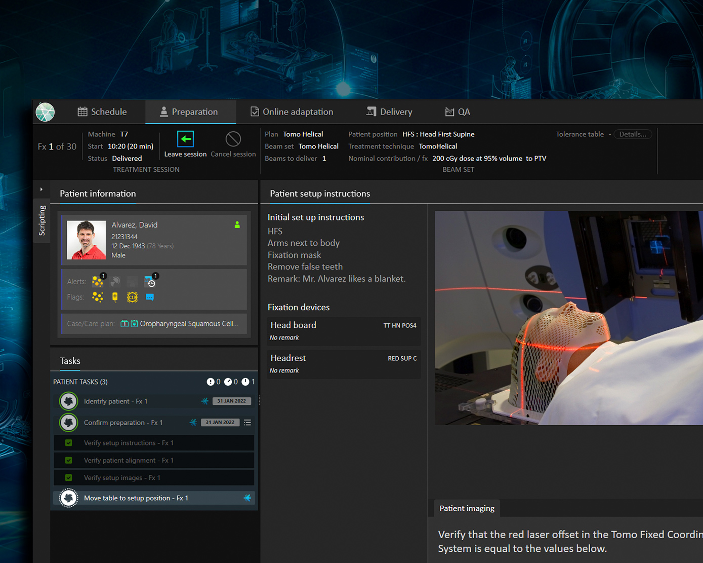 RayCare provides structured management of radiotherapy prescriptions, setup instructions and setup devices. All treatment data is transferred automatically to RayTreat and onto the treatment machine. A continuously updated treatment whiteboard provides a real time overview of the progress of all patient treatments while the treatment course overview workspace serves as a patient specific treatment overview.